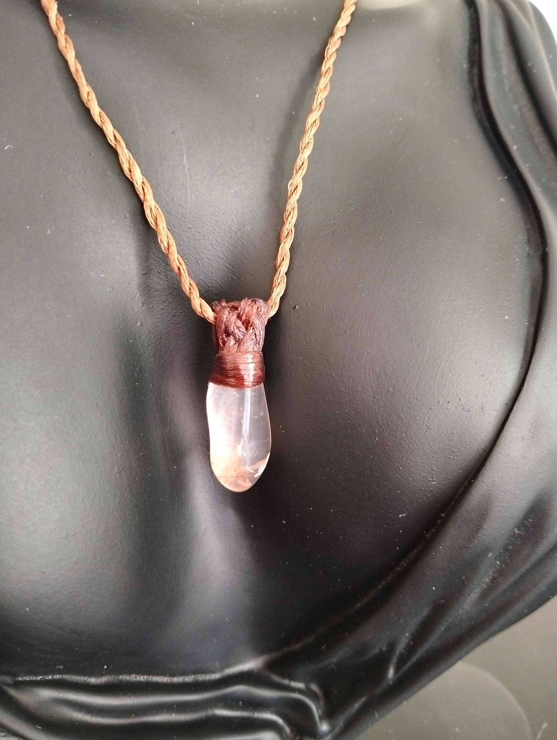 The necklace part is waxed which will wear away in time. It helps lock the wooden bead that holds the pendant at the desired length- as they're adjustable in length. If the bead starts slipping as the wax wears away you can either tie a simple overhand knot behind the bead (which comes undone remarkably easily) or re-wax your necklace with beeswax.