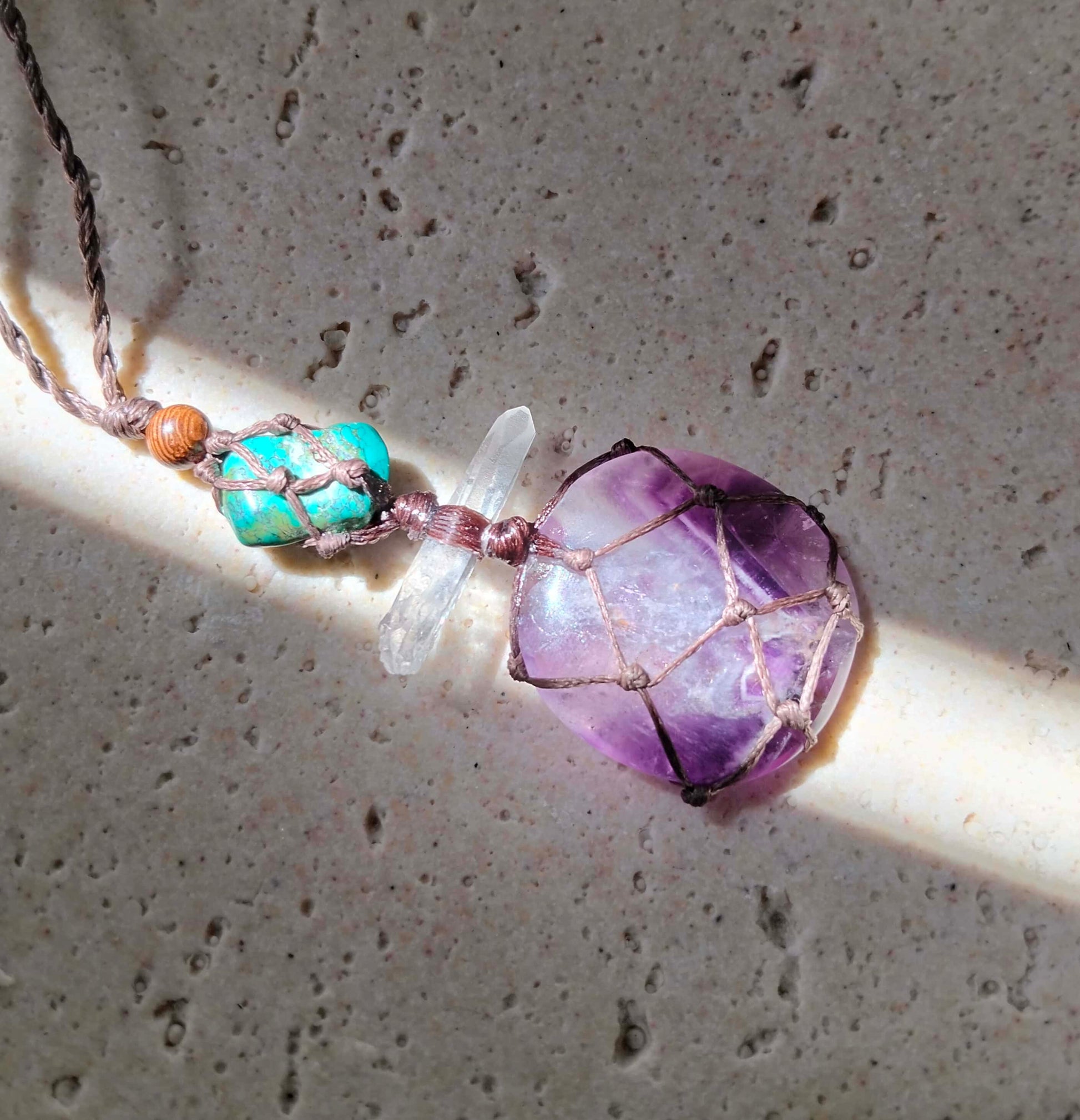 This talisman necklace pairs the calming, protective energy of chevron amethyst with the ancient wisdom of a Lemurian crystal and the vibrant, grounding presence of Tibetan turquoise. The interplay of violet, white, and sky-blue tones creates a striking yet harmonious piece, rich in character and meaning. Thoughtfully composed and one of a kind, it is offered as a wearable talisman—both beautiful and imbued with a sense of intention and timeless spirit.