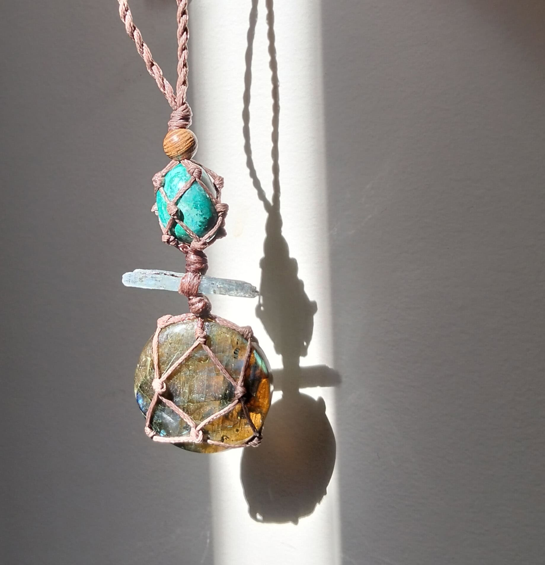 This talisman necklace weaves together luminous labradorite, ethereal kyanite, and tranquil chrysocolla, creating a piece that feels both protective and quietly radiant. Flashing tones of deep blue and soft green shift with the light, evoking intuition, clarity, and calm communication. Designed as a wearable object of intention, this one-of-a-kind necklace offers a sense of balance and inner harmony while making a striking, soulful statement.