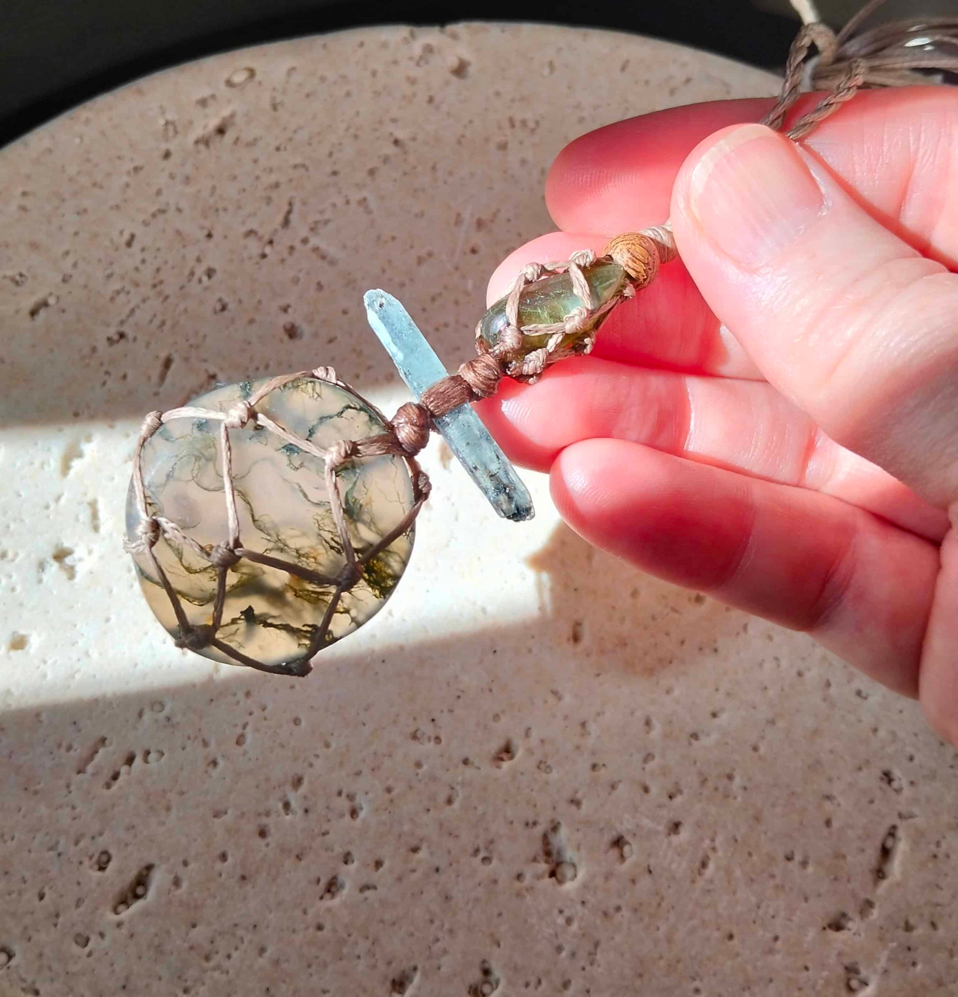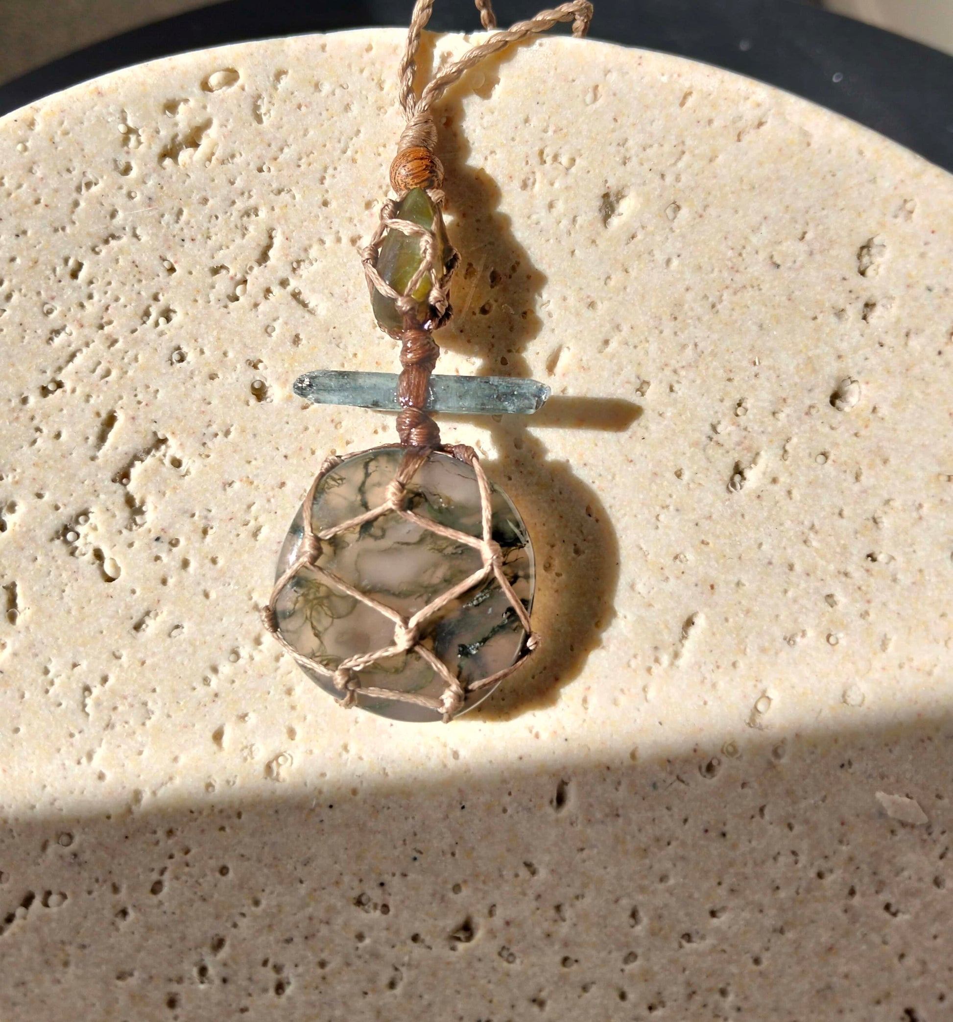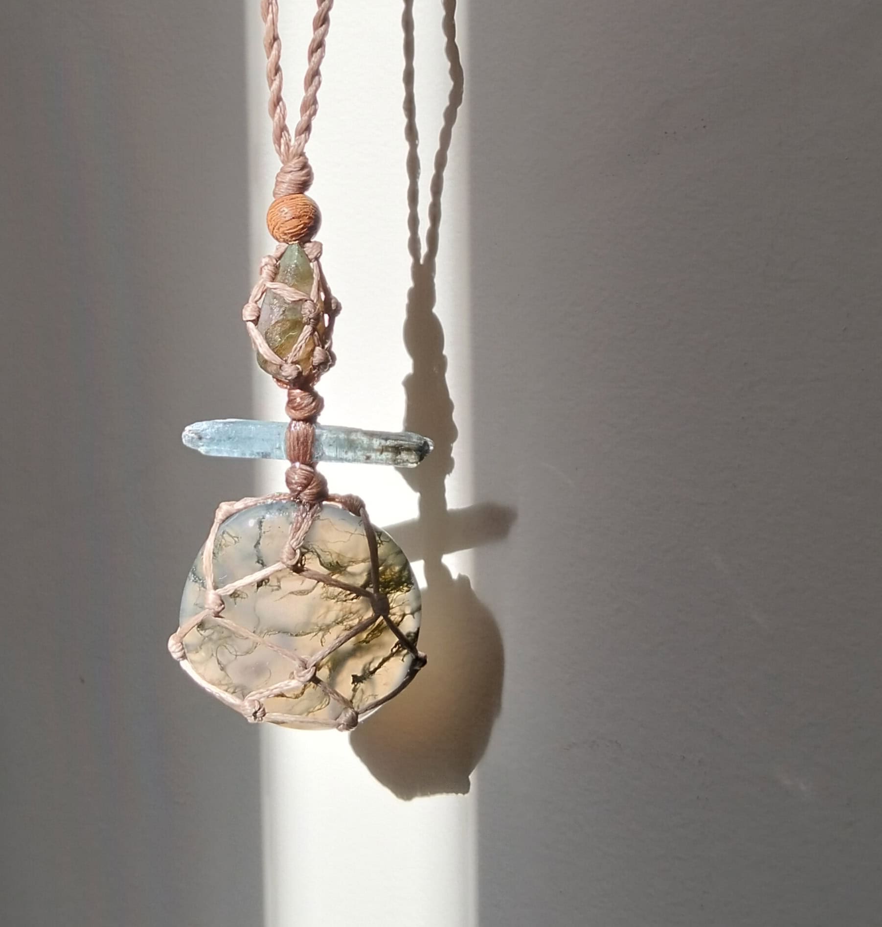 This Moss Agate, Kyanite and Labradorite talisman necklace is a striking union of earth and light, created to inspire balance, intuition and quiet strength. Moss agate evokes a deep connection to nature with its verdant, grounding patterns, while kyanite brings clarity, alignment and effortless flow. Labradorite adds a luminous, mystical touch, flashing with iridescent hues that awaken intuition and inner vision. Together, these stones form a captivating talisman—ideal for those seeking harmony, protection and inspired transformation.